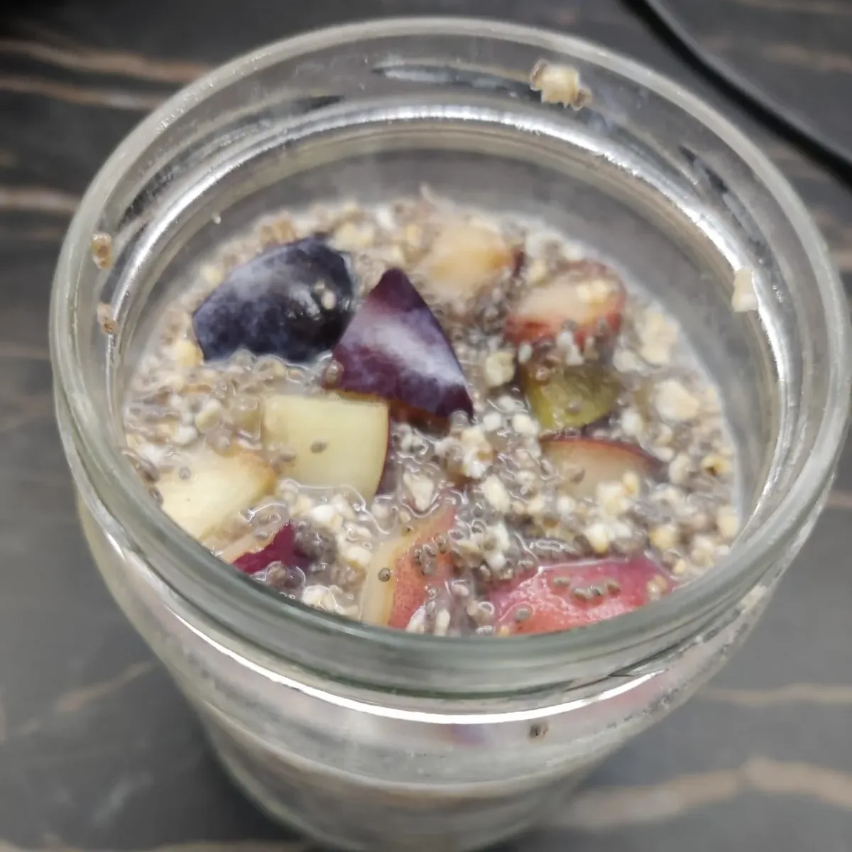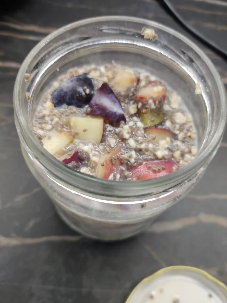 - La sera prima metti in una ciotola o barattolo latte, avena, semi di chia, pesche, e un pò d’acqua per rendere più cremoso (circa 50g) e agita bene. Se ti piace aggiungi cannella.
