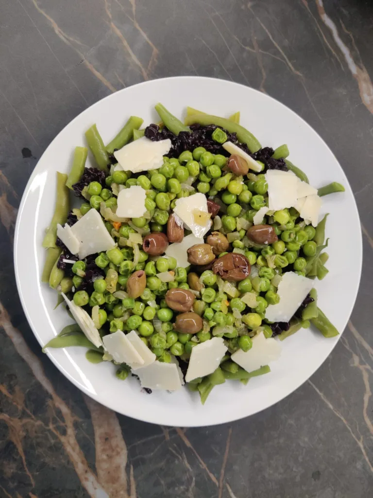 4. Unisci nel piatto fagiolini, riso, piselli, e completa con scaglie di grana e olive.