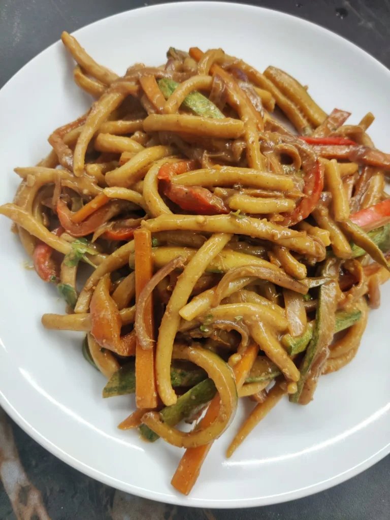 5. Cuoci gli udon in acqua bollente e saltali in padella con verdure uovo e termina con la salsa. Se serve aggiungi acqua di cottura per legare.