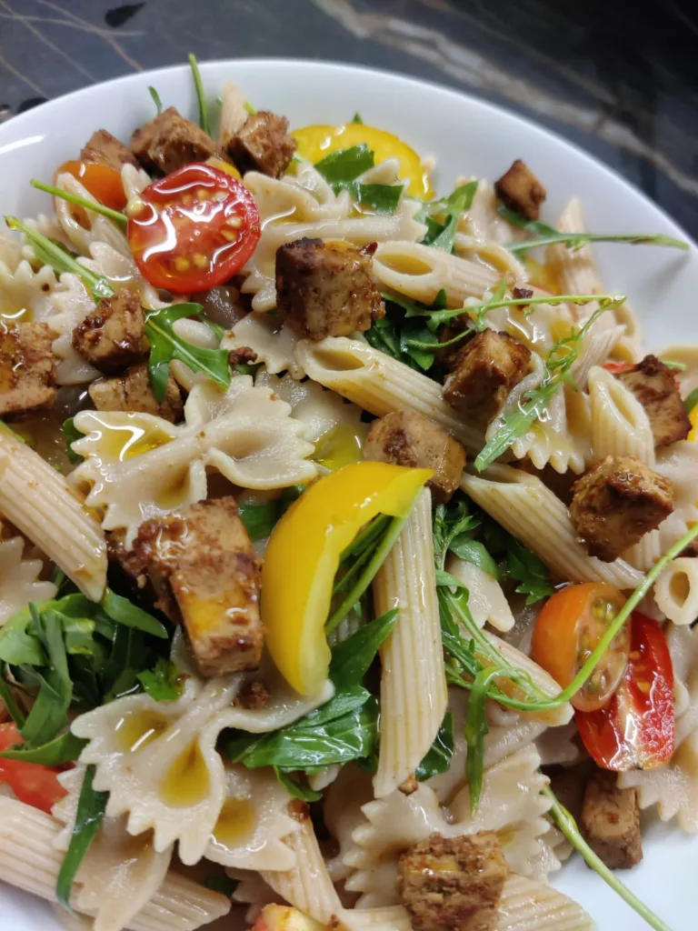 Se hai voglia di estate e un piatto di pasta fresca ma golosa, devi assolutamente provare questo piatto unico, a base vegetale e da fare con la mia fantastica ricetta del bacon tofu, una versione croccante e golosa!