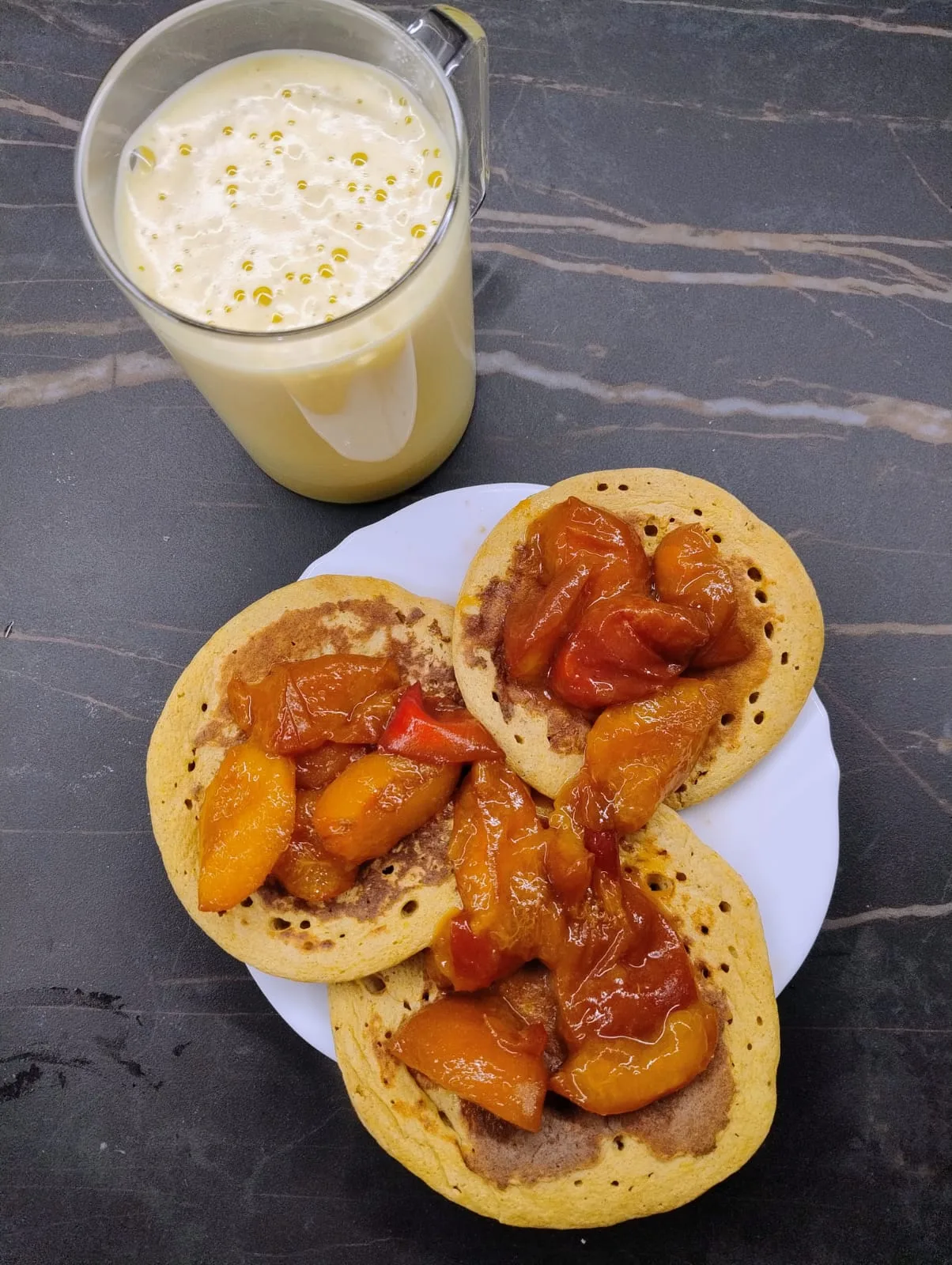 Se comunque vuoi prepararne solo 1, utilizza: 2 albumi (circa 65g) 25g banana, 25g zucca cruda, 30g farina di avena, un pizzico di lievito e cannella. Frulla tutto. Cuoci nel padellino da entrambi i lati. - GOLDEN MILK: ti basterà mettere nel pentolino il latte che preferisci con le spezie. Lascia ben scaldare ed è pronto. Puoi fare questa operazione già direttamente nel monta latte per avere anche la schiuma.