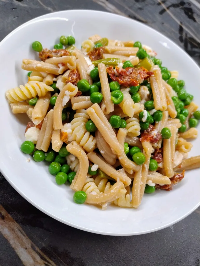 - metti a cuocere la pasta in acqua bollente e salata e a metà cottura butta anche i pisellini.