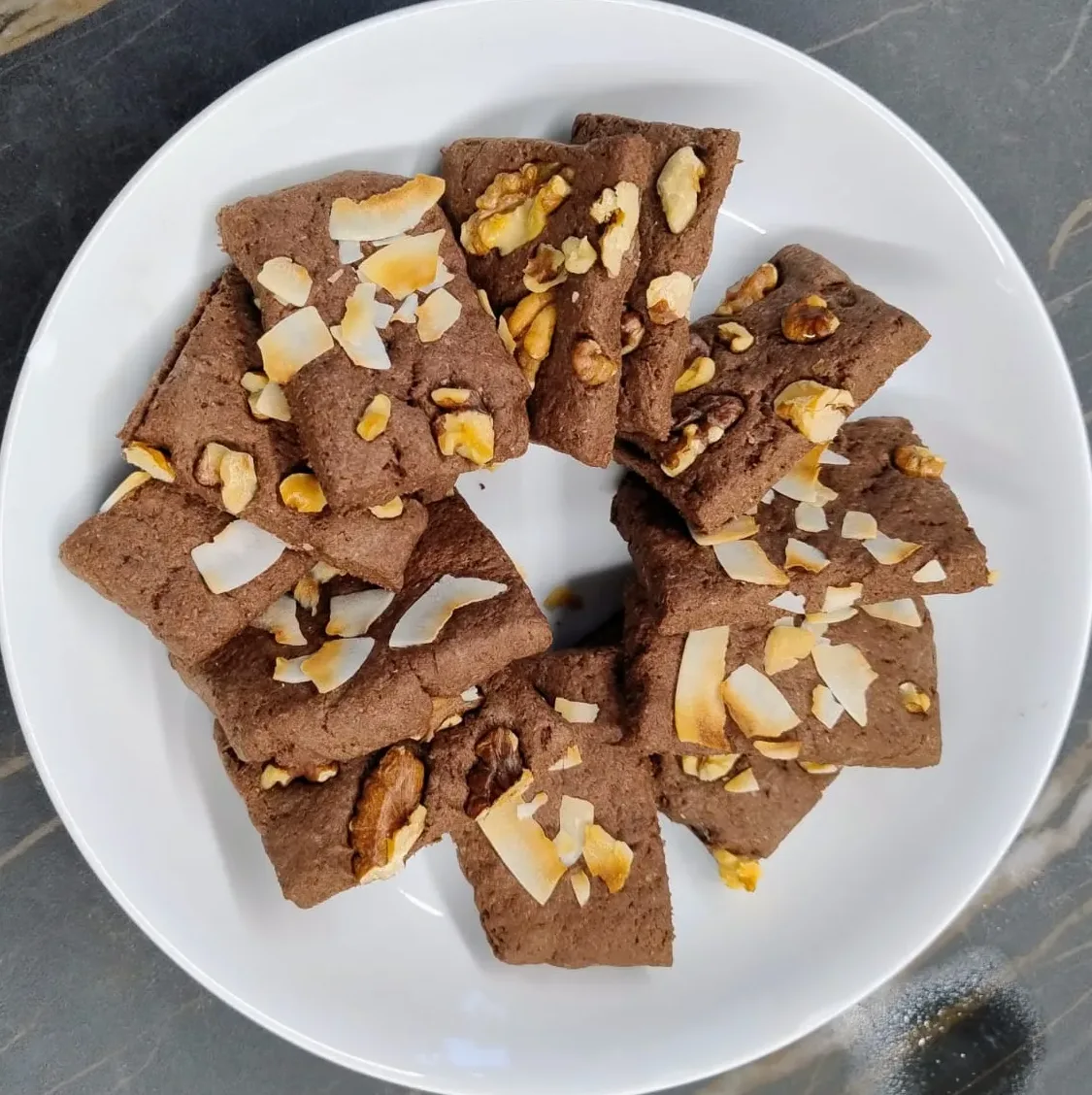 - Decora con scaglie di cocco e noci, taglia dei quadretti e cuoci in forno o friggitrice ad aria. Qui bastano 12 minuti a 170°