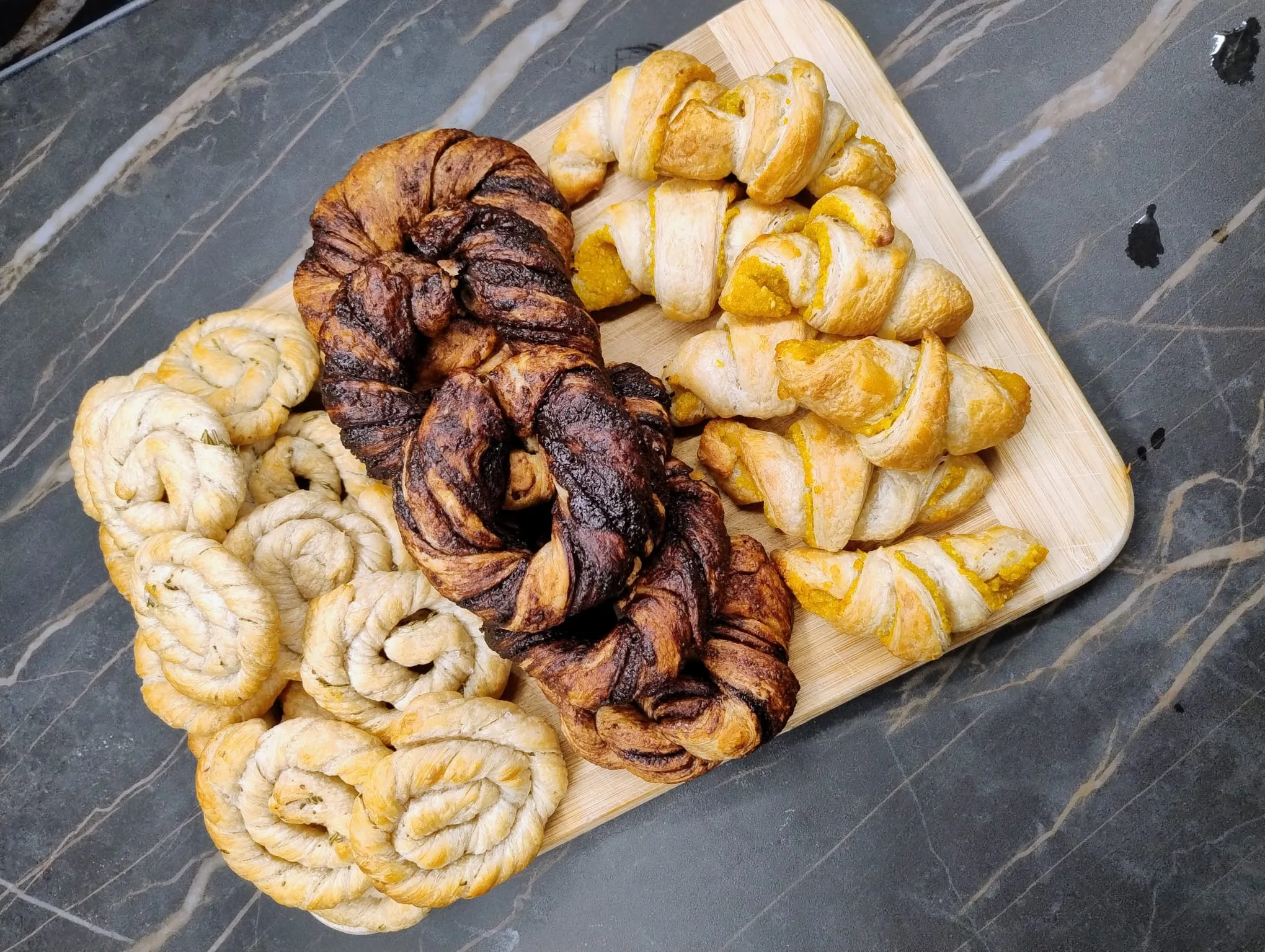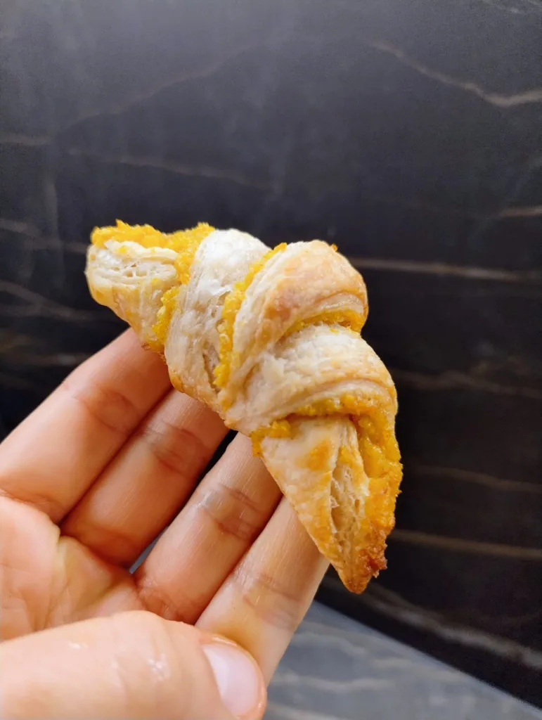 - Spalma bene la farcia su tutta la superficie, ritaglia quindi tanti triangoli molto allungati che avvolgerai su loro stessi per fomrare le brioche. Fai lievitare ancora 1-2h