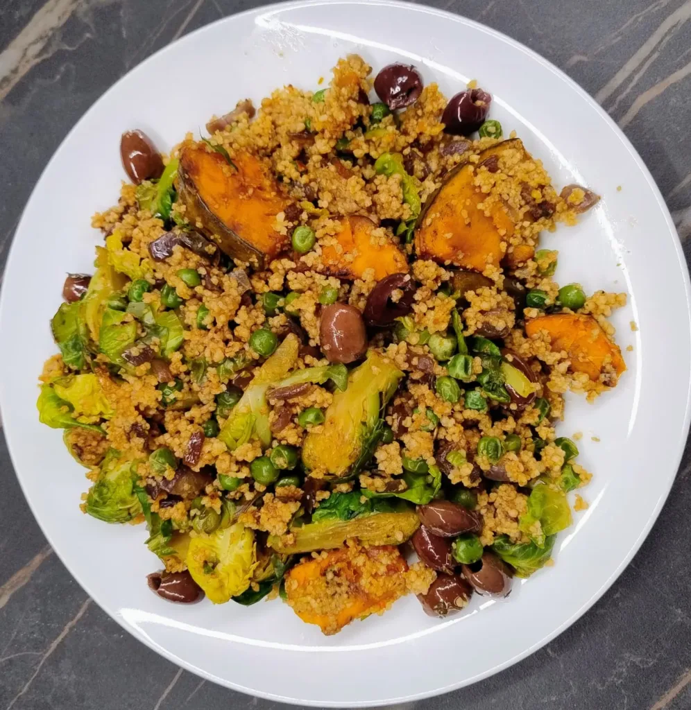 - Trascorso il tempo sgrana il cous cous con una forchetta, e unisci alle verdure e condisci con le olive taggiasche a crudo.