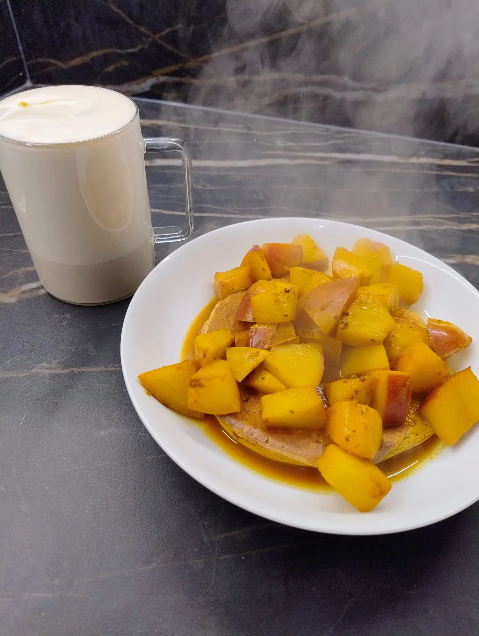Per questa colazione, usiamo la ricetta dei pancake alle carote, che per un inverno così freddo, andiamo a completare con delle pesche spadellate e un bel cappuccino!