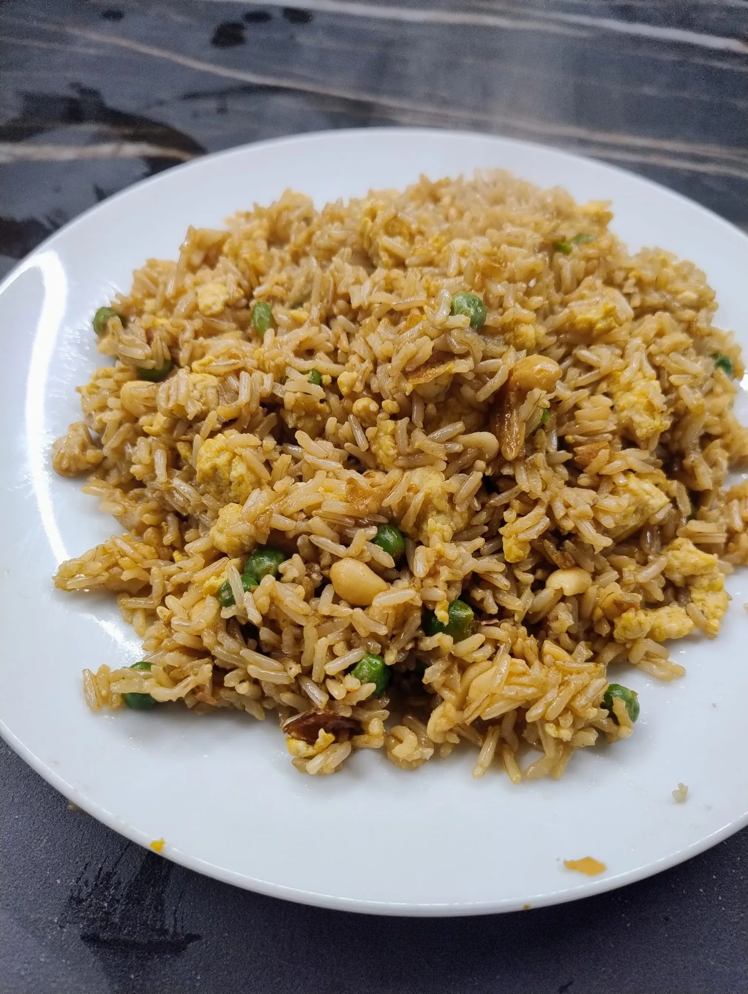 - Una volta pronto il riso scolalo, saltalo in padella con piselli e frutta secca e infine aggiungi l’uovo. Sfuma con salsa di soia ed è pronto!