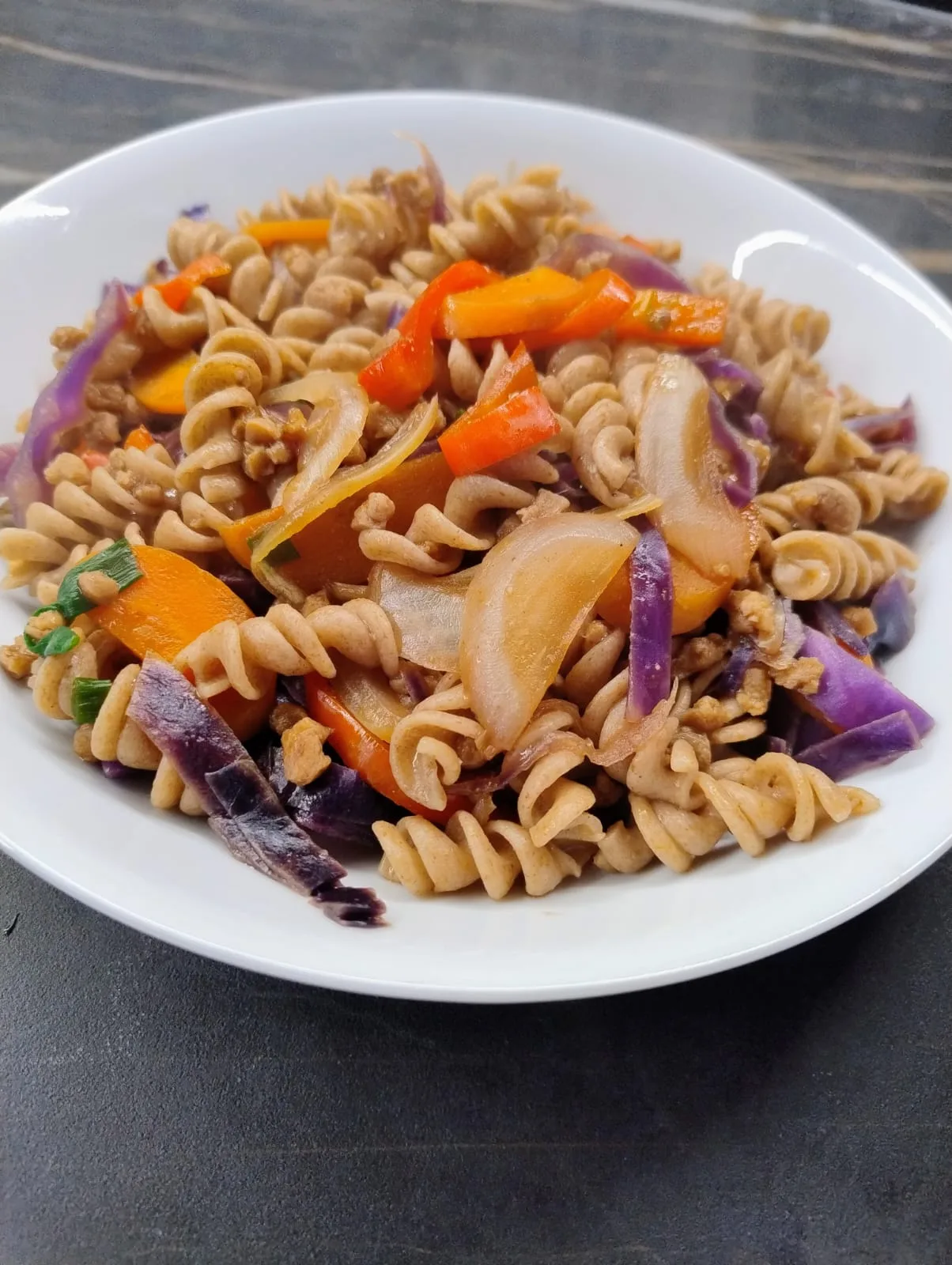 - Nel frattempo in padella cuoci un cipolotto tritato, e fai rosolare con il granulare di soia. Sfuma con la salsa, e reidrata bene aggiungendo acqua al bisogno. Taglia anche tutte le altre verdure e julienne e buttale in padella per 6-7 minuti per farle ammorbidire.